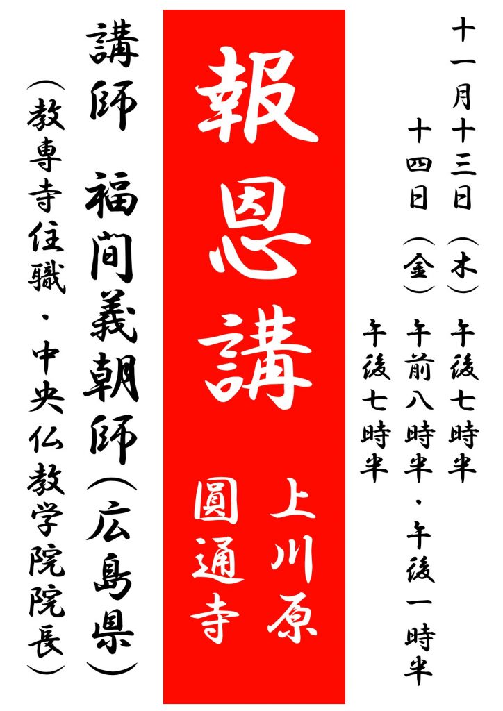 2025年10月15日 / 最終更新日時 : 2025年10月15日 tomonobu お知らせ 報恩講法要を行います 当山報恩講法要を下記のとおりお勤めいたします。 11月13日(木)19時30分 14日(金) 8時30分・13時30分・19時30分 ご講師は福間義朝(ふくまぎちょう)先生です。どなたさまもお気軽にお参りください。
